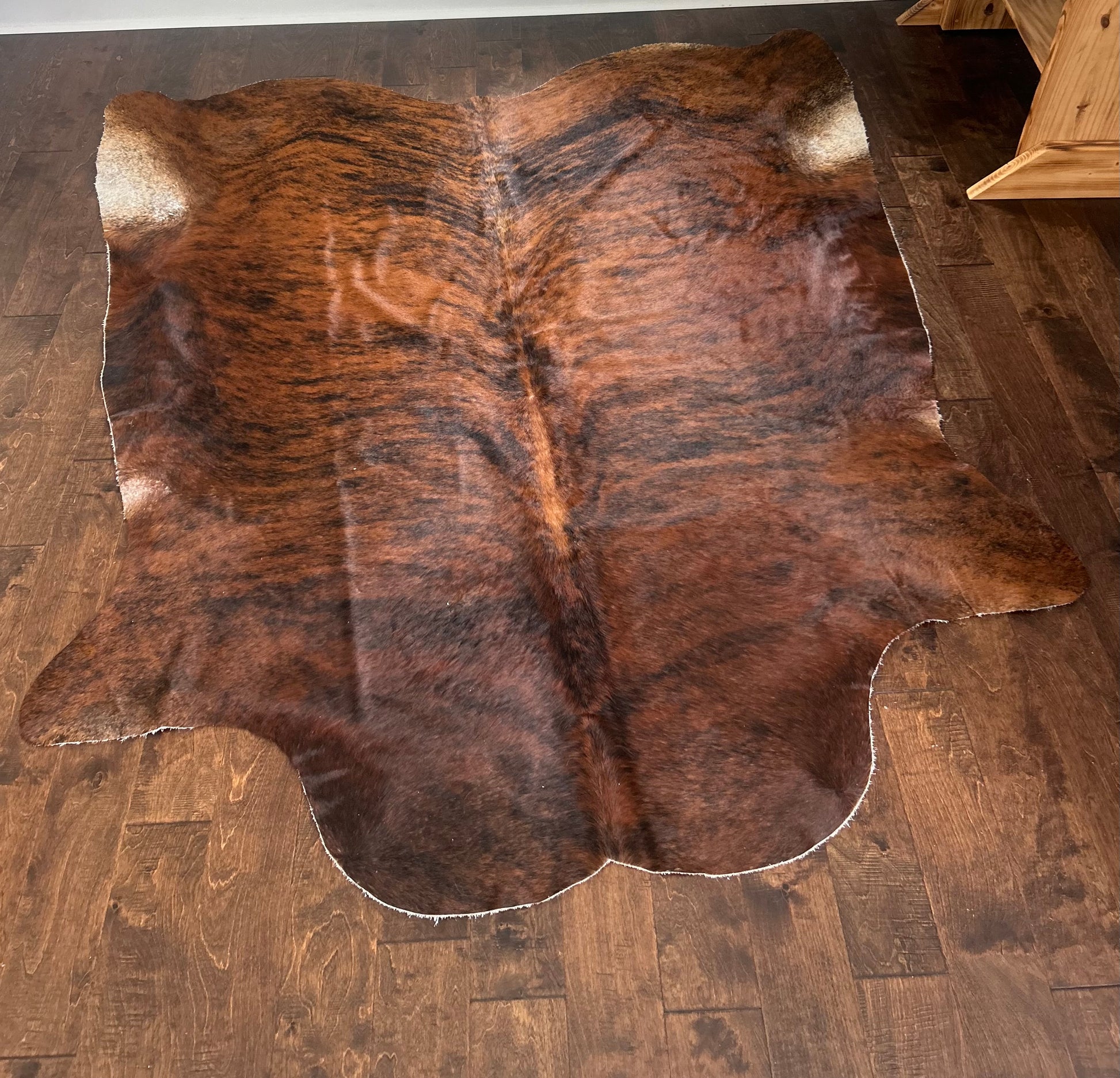 Make a bold western statement with our Columbian Dark Brindle Cowhide in Large. Featuring rich dark brindle tones with natural highlights, each hide is one-of-a-kind and full of rustic character. Perfect for use as a statement rug, layered décor, or even wall display, this genuine cowhide combines durability with timeless western charm in a generous large size.