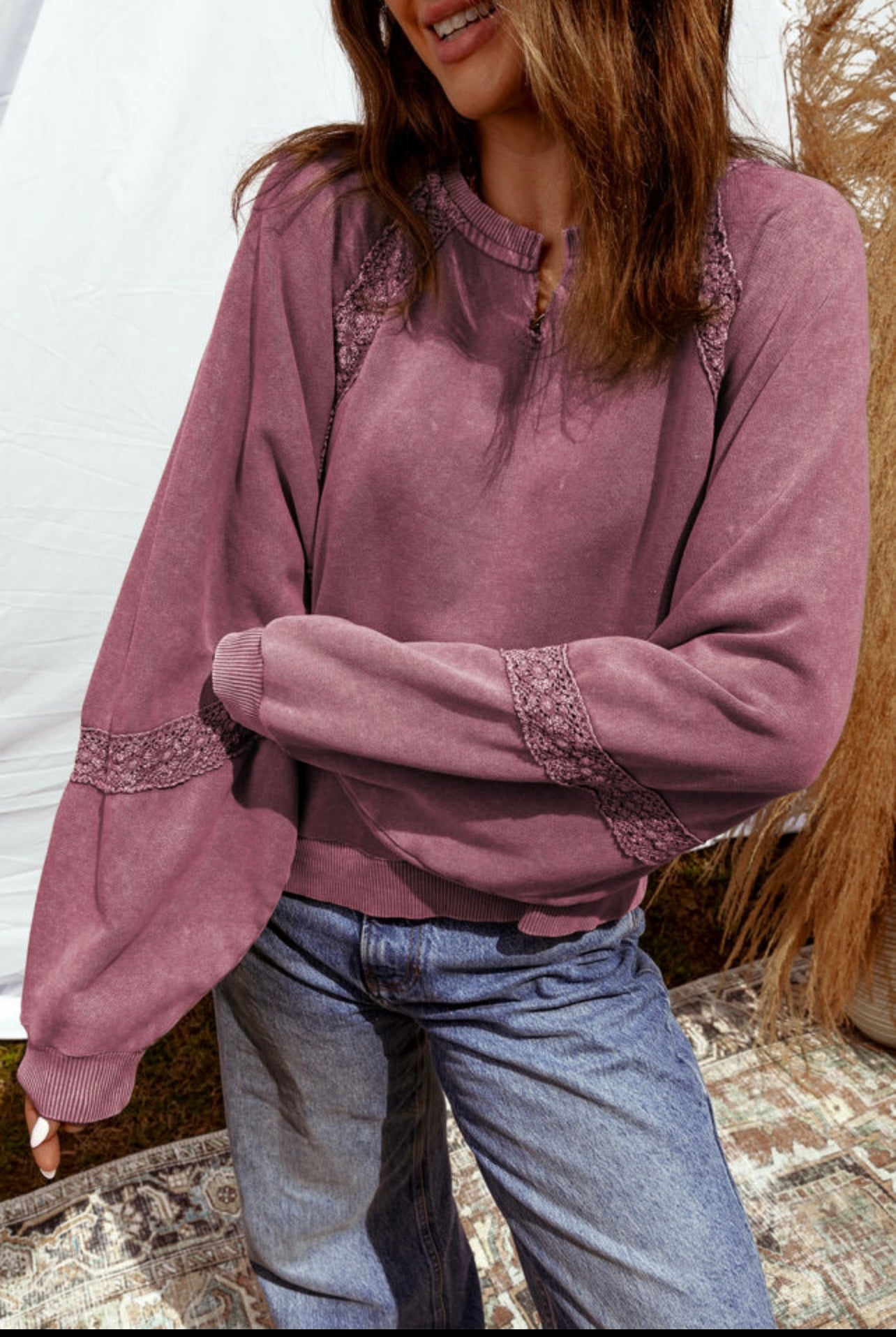 Effortlessly boho with a touch of western flair — this red dahlia mineral wash shirt features delicate lace patchwork details and a flattering notched neckline. Its relaxed, baggy fit gives it that easygoing charm while keeping you comfortable all day long. Perfect for pairing with denim and boots for a laid-back yet feminine look.
